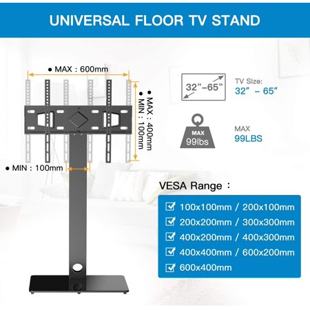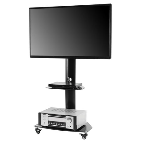 VESA pattern of 200x200, 200x300, 300x300, 400x200, 400x400, 600x400mm, Fit most 32" to 65" flat curved screen TVs, Hold up to 88lbs Samsung LG Sony Sharp Philips Vizio Cello Bush JVC Hitachi Goodmans Toshiba and more, 60larger view angle allow you to choose the healthiest viewing position available and watch TV, Adjusted to 6 different heights from 48.3 to 54.6, 2 black shelves to hold your essential A/V components, cable box, DVD player or gaming systems. HEIGHT ADJUSTMENT - TV rolling stand has 8 steps height adjustable option, height from 50'' to 72"(The height includes the mount and hook.). You can install the TV stand without any hassle. It holds up to 88lbs and is compatible with TV brands such as Sony, Samsung, Sharp, TCL, LG, Vizio, etc.. 15-minute installation, 2 options of mounting TV bracket and 3 sets height adjustment of TV plate to suit different applications or TV sizes, EASY INSTALLATIONUniversal TV stand/base tabletop stand to mount your TV and AV components on an entertainment center or a desk/table. 10mm tempered glass base + wooden shelves.